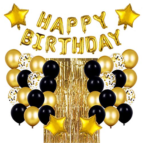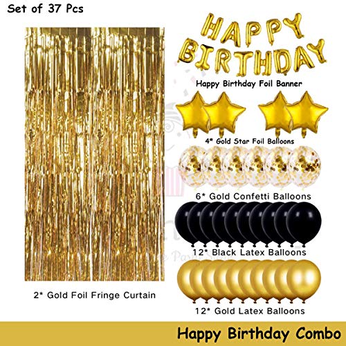 Pop The Party Gold Happy Birthday Balloons Banner Set with Curtain Pack of 37 for Including Latex, Star, and Confetti Balloons