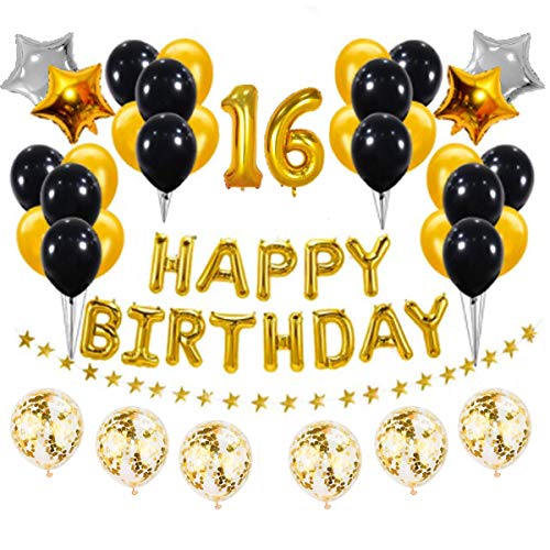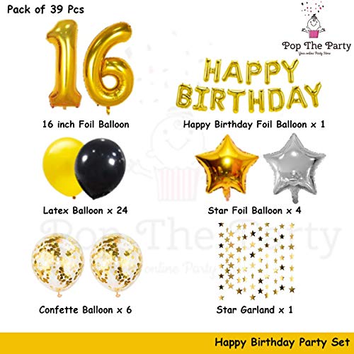 HomeBabyParty SuppliesPop The Party Golden and Black 16th Birthday Party Decorations Set- Gold Happy Birthday Banner,Foil Number Balloons, Latex Balloons and More for 16 Years Old Birthday Party Supplies