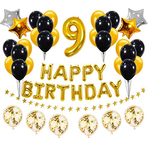 HomeBabyParty SuppliesPop The Party Golden and Black 9th Birthday Party Decorations Set- Gold Happy Birthday Banner,Foil Number Balloons, Latex Balloons and More for 9 Years Old Birthday Party Supplies
