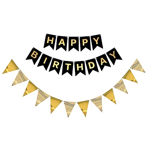 Pop The Party Happy Birthday Banner Party Hanging Paper Triangle Bunting Decoration for Birthday (Black Gold)