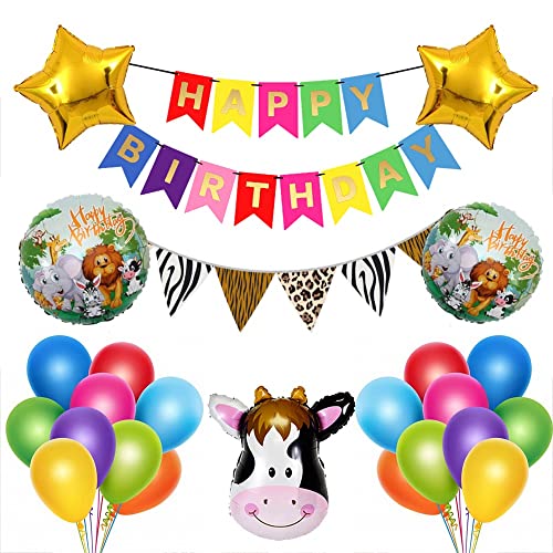 Package Includes: This Beautiful Jungle Theme Party Decorations Set Include: 1X Happy Birthday Banner1 X Triangle Bunting50Pcs Multi Balloon1 Cow Foil Balloon2 Round Balloon2 Star Foil Balloon