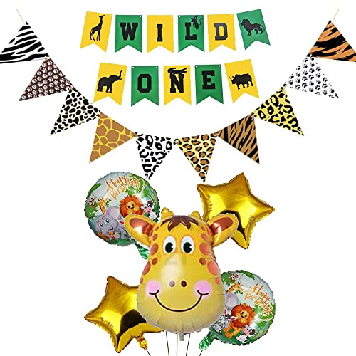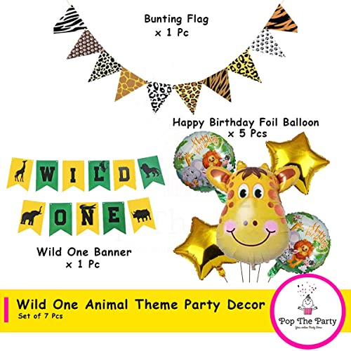 This Package Includes : One Giraffe Foil Balloon 1 Wild One Banner One Triangle Jungle Theme Bunting 2 Gold Star Foil Balloon And 2 Round Elephant And Tiger Printed Foil Balloon Set Of 7 Pieces.
