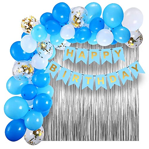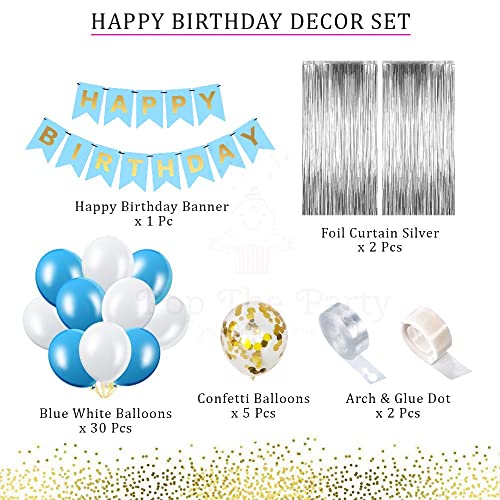 HomeBabyParty SuppliesPop The Party Light Blue Birthday Banner Party Decorations Kit Gold Confetti,white And Blue Balloons, Arch,Glue Dot And silver Curtains for Boys Girls Men Women Birthday Party Decoration (lightblue)