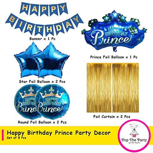 Pop the Party Prince Foil Balloon Set with Happy Birthday Banner and Gold Curtain for Decoration