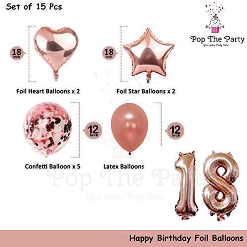 HomeBabyParty SuppliesPop The Party Rose Gold 18 Balloon For 18th Birthday - Large Pack of 16 | Rose Gold Confetti Star and Heart Foil Balloon Bouquet For Party Decoration | Great For 18th Birthday Party Decoration Suplies