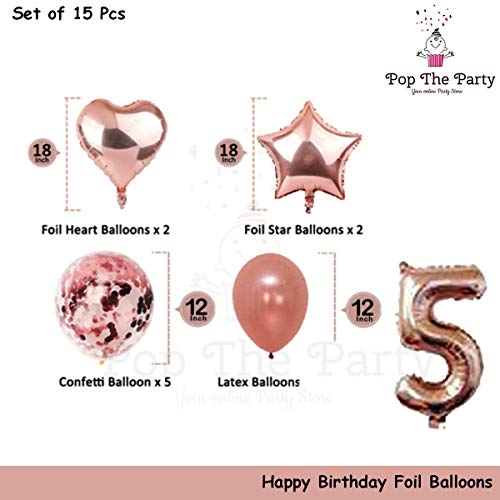 HomeBabyParty SuppliesPop The Party Rose Gold 5 Balloon for 5th Birthday -Large Pack of 15 | Rose Gold Confetti Star and Heart Foil Balloon Bouquet for Party Decoration | Great for 5th Birthday Party Decoration Suplies