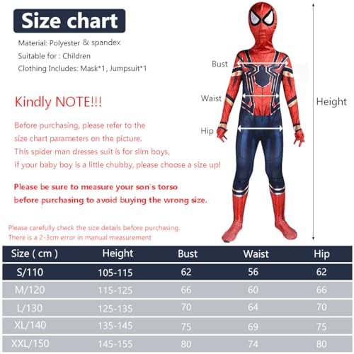 • PREMIUM FABRIC: Our spider man kids costume is made of premium Polyester and stretch spandex fabric soft and breathable skin-friendly fabric is comfortable to wear. The spiderman the suit is washable and easy to clean. Hidden zipper design easy to wear an