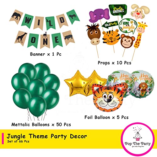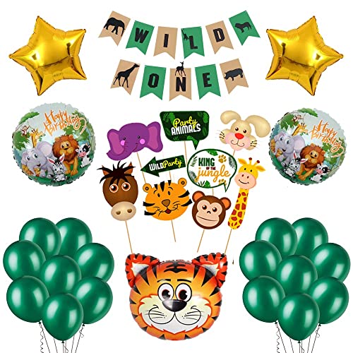 Package Includes: This Beautiful Jungle Theme Party Decorations Set Include: 1X Wild One Banner10 Pcs Props50Pcs Green Balloon1 Tiger Foil Balloon2 Round Balloon2Star Foil Balloon