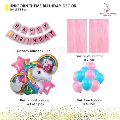 Pop The Party Unicorn Foil Balloon Round And Star Foil Balloon And Bithday Banner With balloon For Decoration Kit of 58