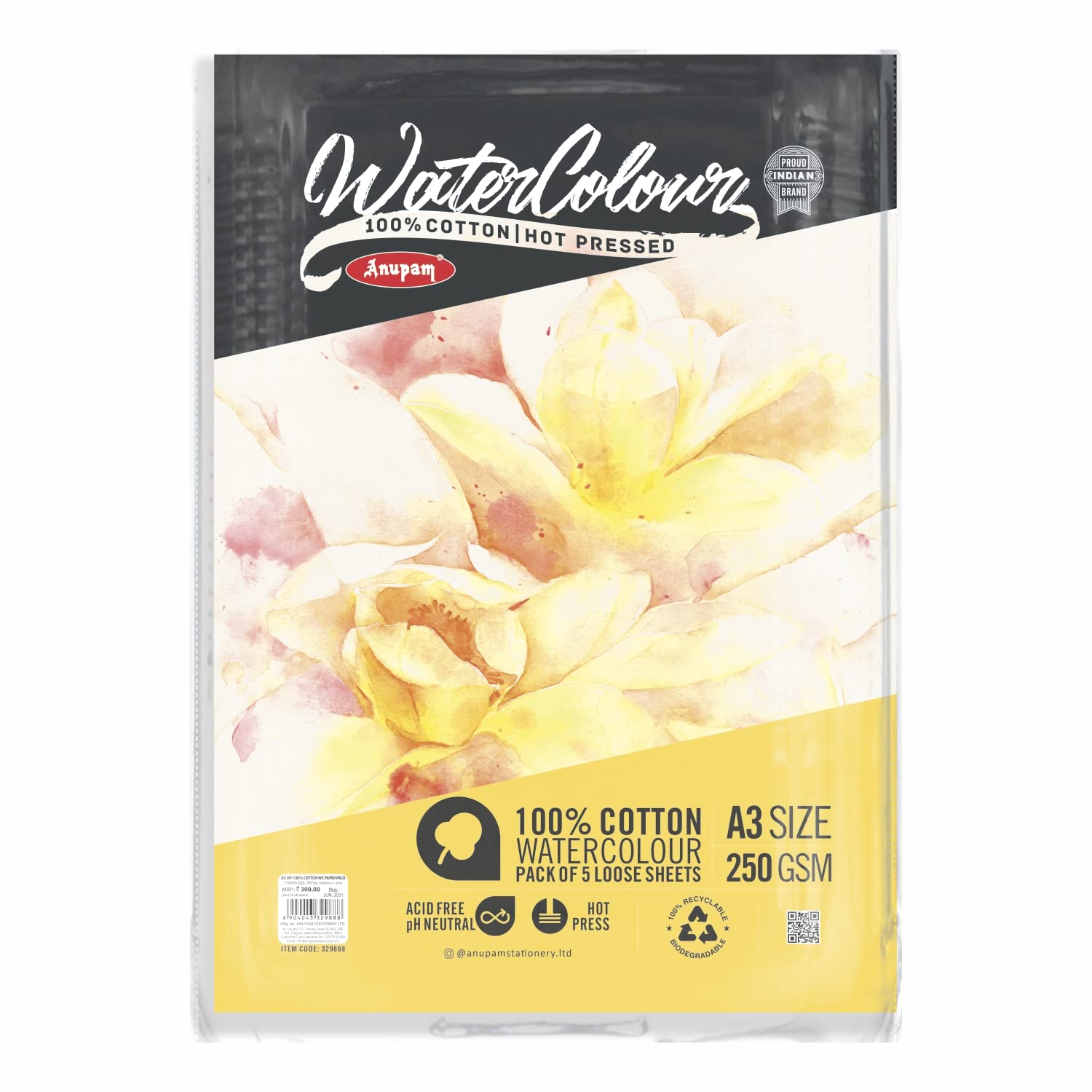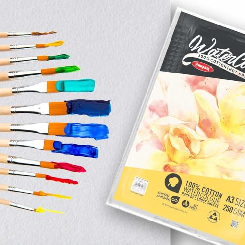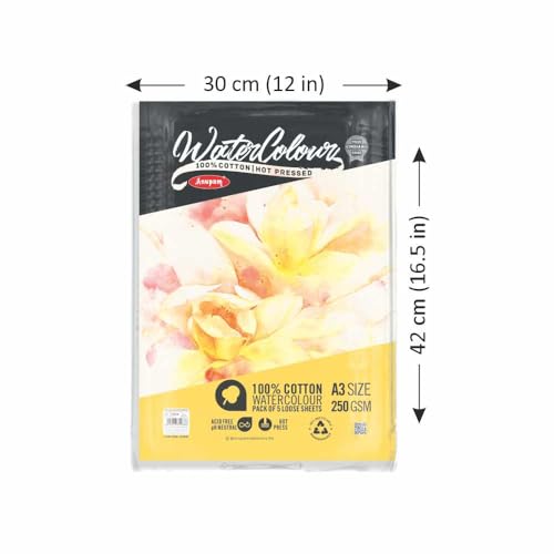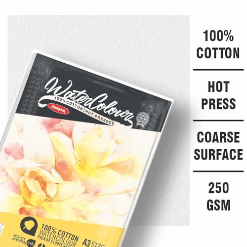 Anupam 100% Cotton Watercolour Paper Loose Sheets - Natural White - Hot Pressed Paper - 250 GSM - 10 Pages - A3