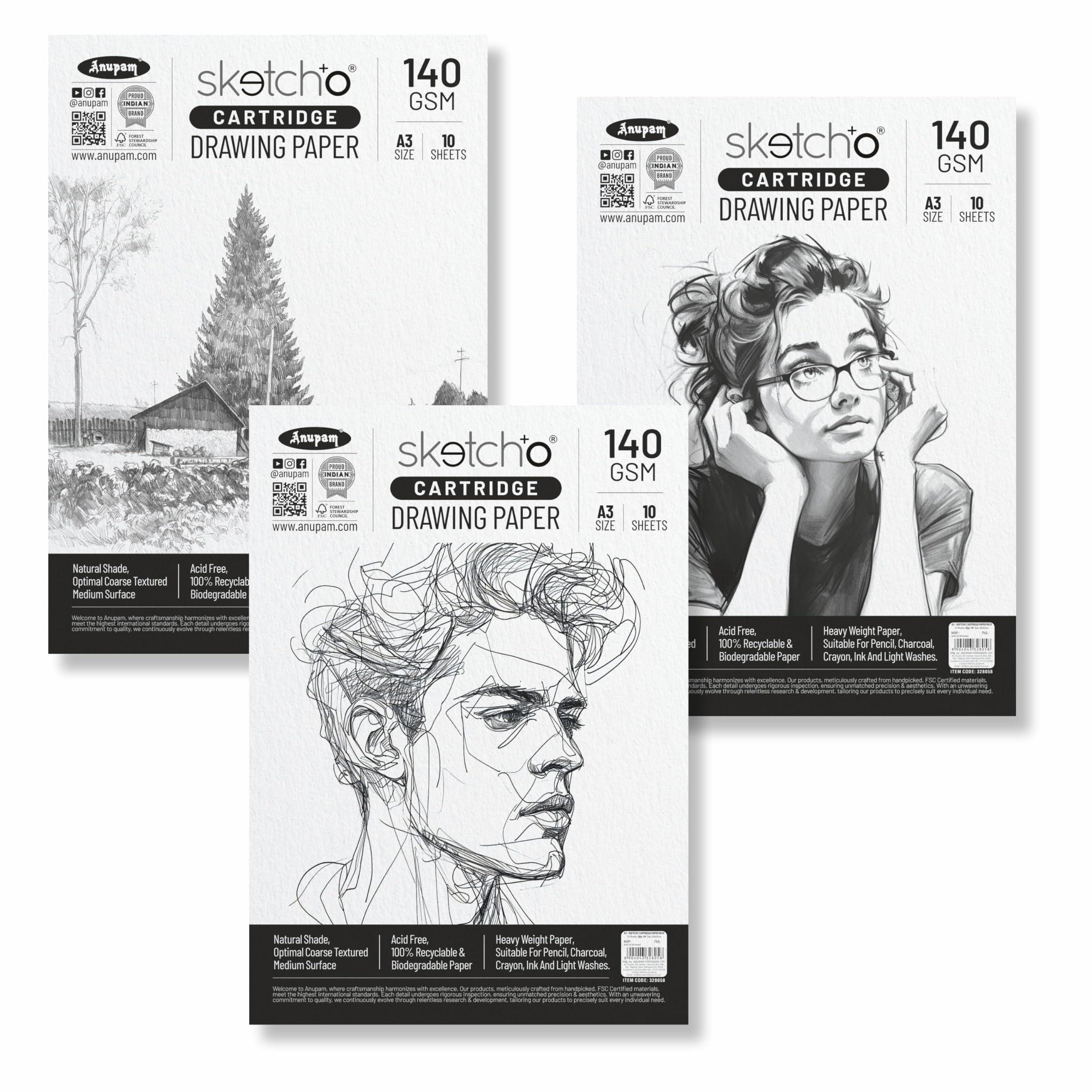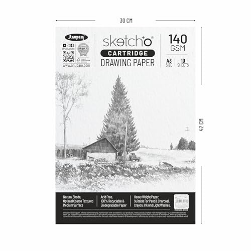 Anupam is an in-house manufacturing brand which supplies stationery products and art materials in India. It was incepted in the year 1973Anupam stationery prides in providing only the highest quality. Whether its a reflection of our happiness our grief our joy our wonder or our longing art is the legacy we will leave behind to tell future generations who we were at this place in time.Although Anupam started its journey with papers it now has an array of art products starting from papers and canvases to easels and takes pride in supplying quality products at an affordable rate.We want to ensure you have a great experience with our products because we truly care about our customers. we're proud of so purchase our products with the confidence. Ideal Use: Sketching drawing doodling graphite painting charcoal painting watercolors acrylic paint ink and pencil thanks to its premium surface. Best sketch book for sketching Sizes available - A5 A4 - Portrait Square (20cm x 20cm) A6 and A3 - Portrait High-quality drawing paper may be used with a variety of media including The ideal paper for sketching drawing manga cartoons still life stippling and experimenting with new techniques Strong smooth and easily absorbing colors and lines which reduces blotching smudges and accidents. Coloring book sketchbook and blank-page book appropriate for all ages Thickness: 140 GSM Cartridge Paper Type of Binding: Hardbound Paper Colour: Natural Shade Cartridge Paper Type of Paper: Optimal Coarse PH Neutral and Acid-Free Paper Number of Pages: 128 in all the sizes