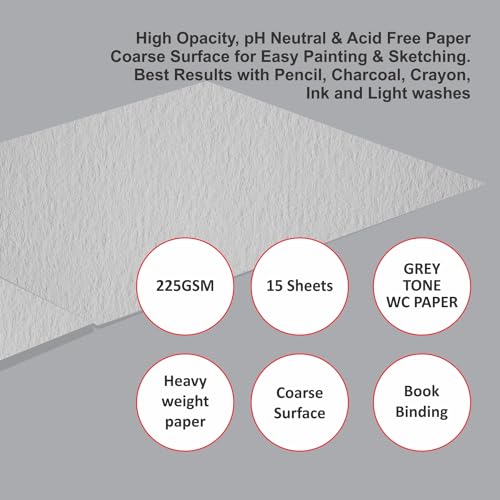 Best for watercolour painting gouache Painting water colour Inks sketching with charcoal pencils graphite pencils and mandala art Type of Binding: 1 side glued pad Number of Sheets: 15 Pages in all the sizes Paper colour: Grey colour water colour paper Type of Paper: Cotton Cold Pressed pH Neutral paper Acid free paper Fine Grain textured watercolour paper Archival paper Surface: Optimal Coarse for easy painting High opacity paper Both sides of the paper is usable Paper is imported from Europe