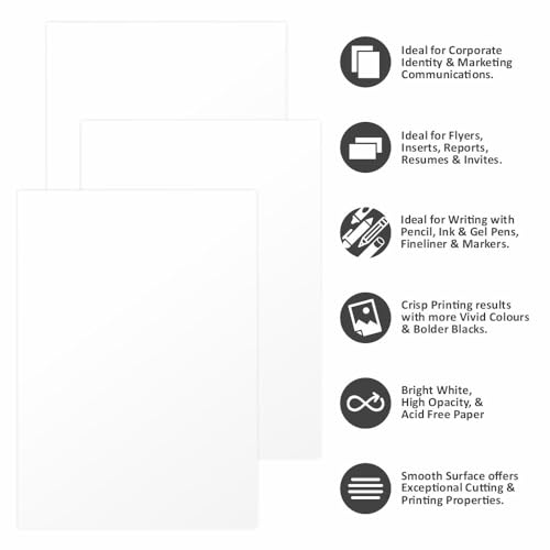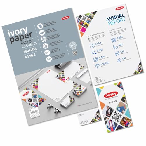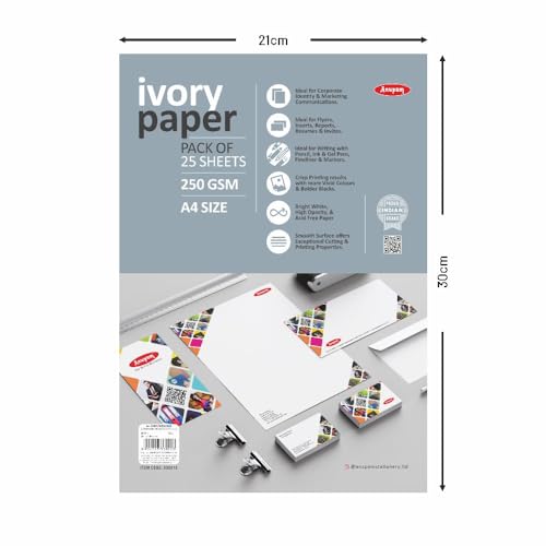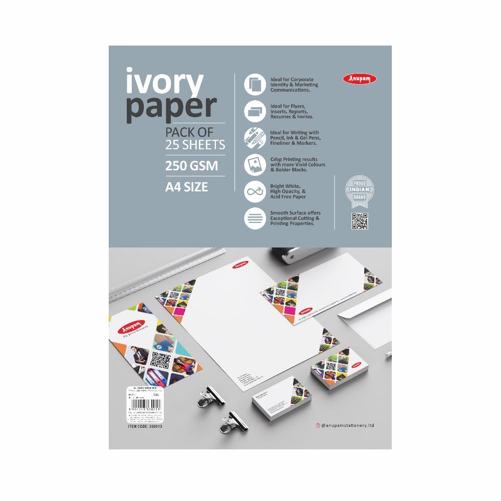 Anupam is an in-house manufacturing brand which supplies stationery products and art materials in India. It was incepted in the year 1973Anupam stationery prides in providing only the highest quality. Whether its a reflection of our happiness our grief our joy our wonder or our longing art is the legacy we will leave behind to tell future generations who we were at this place in time.Although Anupam started its journey with papers it now has an array of art products starting from papers and canvases to easels and takes pride in supplying quality products at an affordable rate.We want to ensure you have a great experience with our products because we truly care about our customers. we're proud of so purchase our products with the confidence. Ideal for Corporate Identity and marketing communications Ideal for Flyers inserts reports resumes and invites Ideal for writing with pen pencil ink gel pens fineliners and markers Crisp printing results with more vivid colours Black colour works wonders with this paper Colour of the paper: Bright White High Opacity paper Acid free paper Smooth surface offers exceptional cutting and printing properties Ivory Printing Paper Indian Paper Thickness of the paper: 250 GSM Best quality paper when compared to the pricing Sizes available: A3 and A4 Number of Sheets: A3 - 25 sheets and A4 - 25 sheets