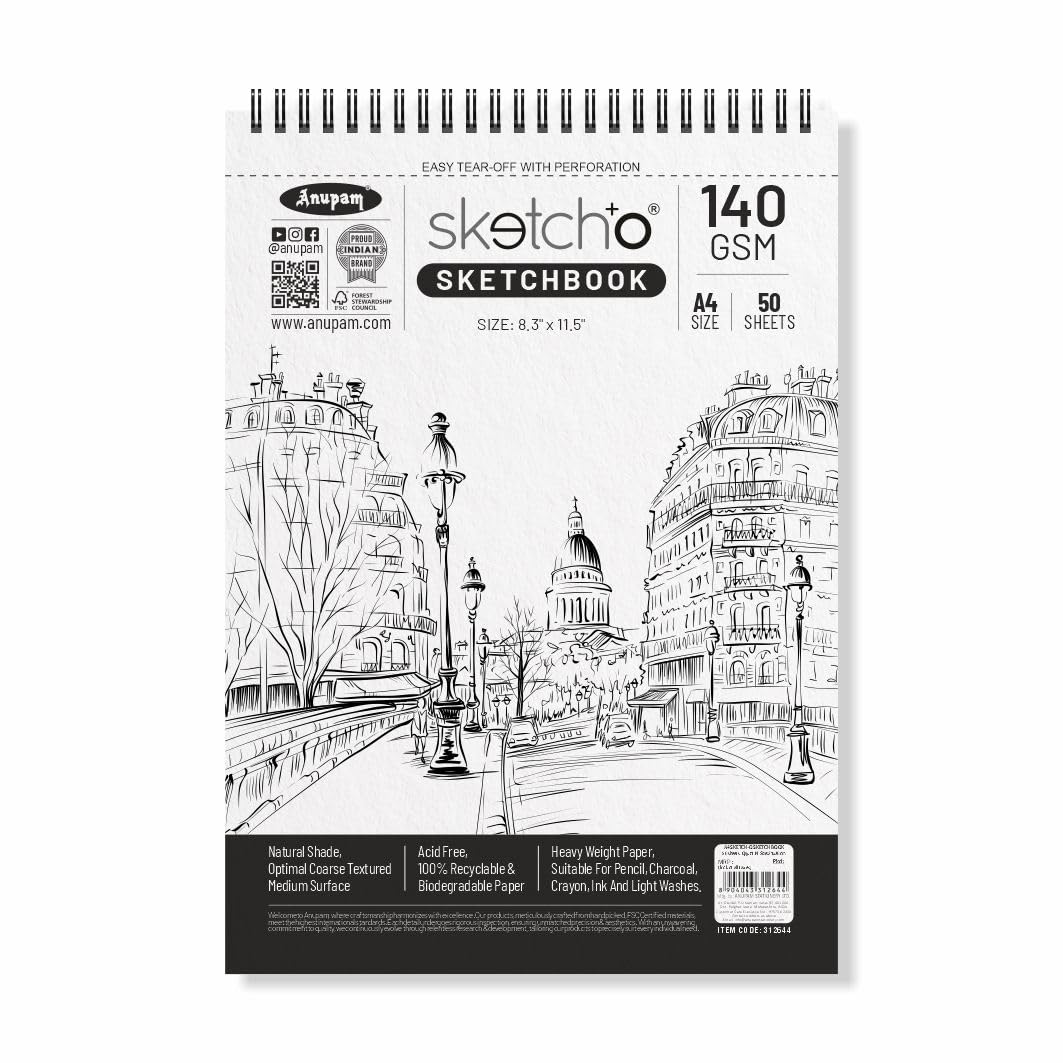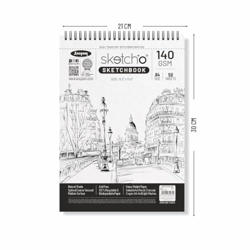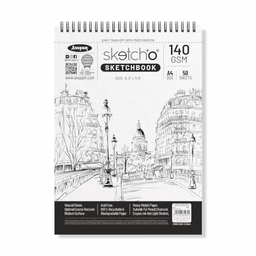 Anupam is an in-house manufacturing brand which supplies stationery products and art materials in India. It was incepted in the year 1973Anupam stationery prides in providing only the highest quality. Whether its a reflection of our happiness our grief our joy our wonder or our longing art is the legacy we will leave behind to tell future generations who we were at this place in time.Although Anupam started its journey with papers it now has an array of art products starting from papers and canvases to easels and takes pride in supplying quality products at an affordable rate.We want to ensure you have a great experience with our products because we truly care about our customers. we're proud of so purchase our products with the confidence. Ideal Use: Sketching drawing doodling graphite painting charcoal painting watercolors acrylic paint ink and pencil thanks to its premium surface. Best sketch book for sketching Sizes available - A5 A4 - Portrait Square (20cm x 20cm) A6 and A3 - Portrait High-quality drawing paper may be used with a variety of media including The ideal paper for sketching drawing manga cartoons still life stippling and experimenting with new techniques Strong smooth and easily absorbing colors and lines which reduces blotching smudges and accidents. Coloring book sketchbook and blank-page book appropriate for all ages Thickness: 140 GSM Cartridge Paper Type of Binding: Hardbound Paper Colour: Natural Shade Cartridge Paper Type of Paper: Optimal Coarse PH Neutral and Acid-Free Paper Number of Pages: 128 in all the sizes