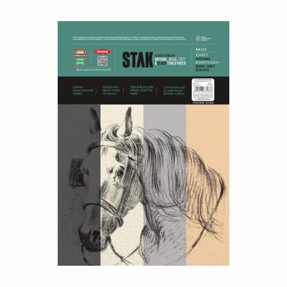 Anupam is an in-house manufacturing brand which supplies stationery products and art materials in India. It was incepted in the year 1973Anupam stationery prides in providing only the highest quality. Whether its a reflection of our happiness our grief our joy our wonder or our longing art is the legacy we will leave behind to tell future generations who we were at this place in time.Although Anupam started its journey with papers it now has an array of art products starting from papers and canvases to easels and takes pride in supplying quality products at an affordable rate.We want to ensure you have a great experience with our products because we truly care about our customers. we're proud of so purchase our products with the confidence. Anupam stak 4 colors toned paper A4 size There are 1 sheet natural 3 sheets each ( beige grey & black ) 10 sheet Optimal Coarse Textured Surface Beautiful colors of paper will make your drawing stand out no matter what color you put on it You can work on more diverse art materials such watercolor acrylic colored pencils graphite pencils pens markers charcoal pastel etc. Anupam Stak Tone paper Acid-free paper won't let colors fade. It quickly absorbs water keeping your paints looking as vibrant as ever with no bleed through. This watercolour paper helps you achieve artistic beauty. Adding a colored background to your work helps to add atmosphere to your paintings as well as give them extra depth and dimension. ideal for beginners students and professionals. For those who have found a beige gray or black paper or tan paper this will be a stunning choice to use four colors together