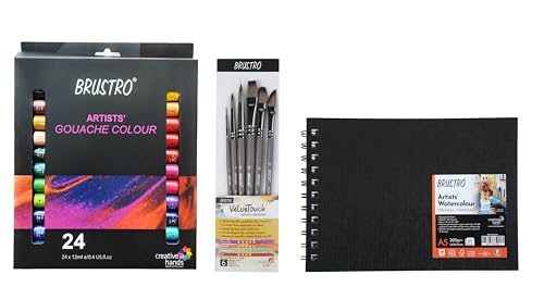 Brustro Artists Gouache Colour Set of 24 Colours X 12ML Tubes with 25% Cotton Watercolour Wiro Journal Cold Pressed 200 GSM A5-25 Sheets and VelveTouch Artist Brushes Set of 6