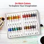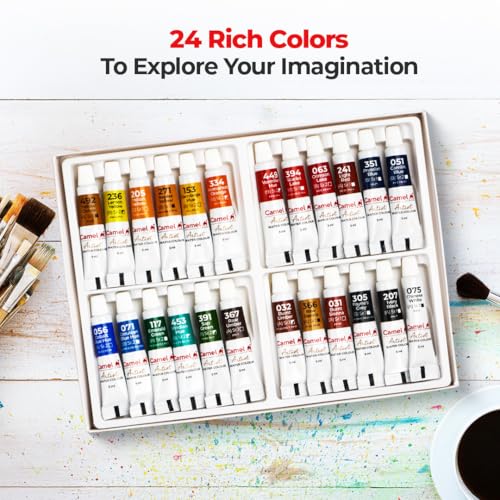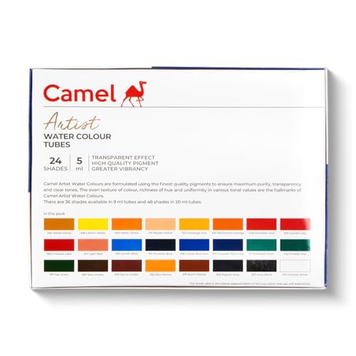 Set of 24 assorted shades in 5ml tube ideal for professional artists serious hobbyists fine art students design students vocational training students Shades in Pack: Sap green raw umber emerald green burnt sienna cobalt blue hue raw sienna Prussian blue ivory black light red Chinese white crimson lake scarlet lake vermilion hue Naples yellow permanent orange Camlin blue yellow ochre Indian yellow gamboge hue olive green lemon yellow cerulean blue hue burnt umber Payne's grey Confirms to safety standard ASTM- AP certification Formulated using only the finest quality ingredients to ensure maximum purity transparency and clear tones The even texture of color richness of hue and uniformity in various tonal values are the hallmarks of Camel Artists' Water Colors Report incorrect product information.