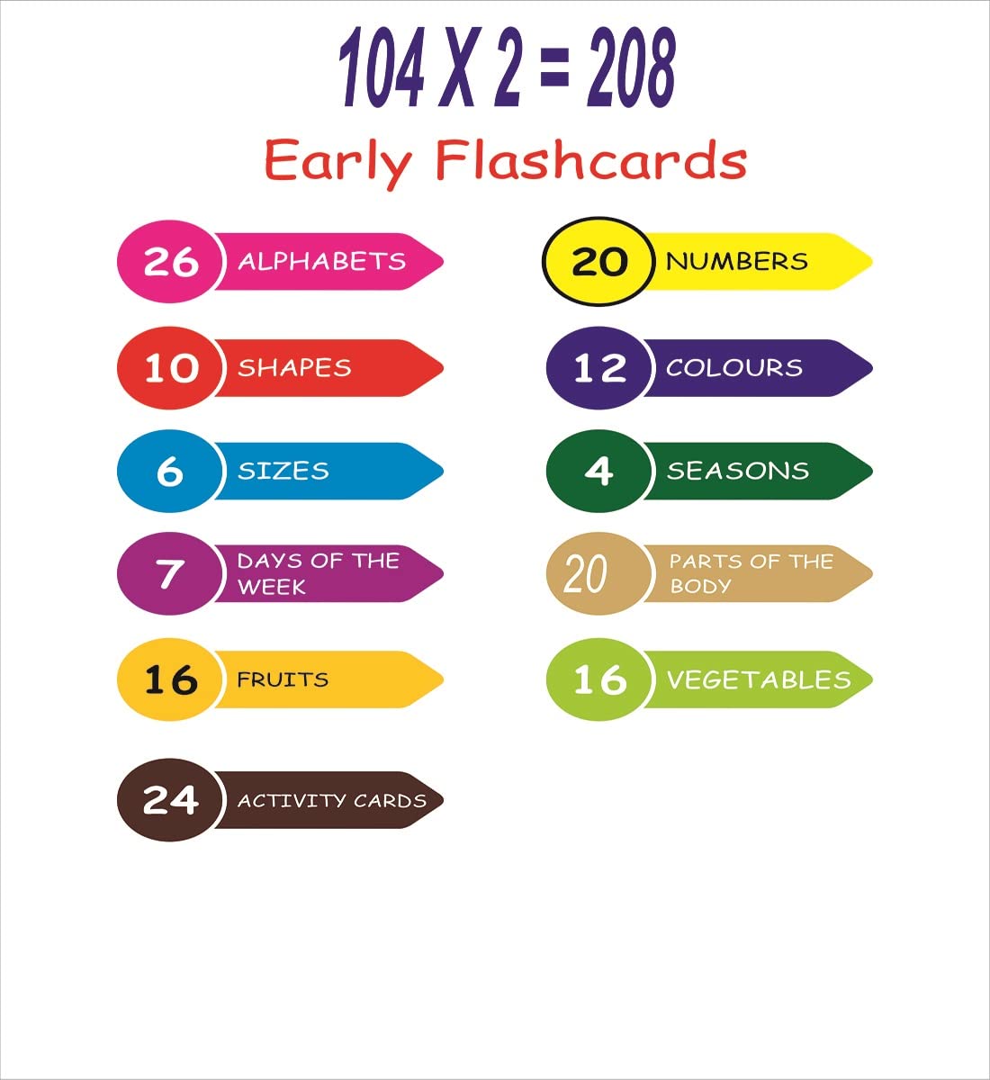 GEOKRAFT English 208 (104 X 2 Double Sided) Big Flash Cards for Kids (Logiplay) Alphabet Numbers Shapes Colors Fruits Vegetables Seasons Size Week Days Body Parts Activity Cards for 2+ Years Old