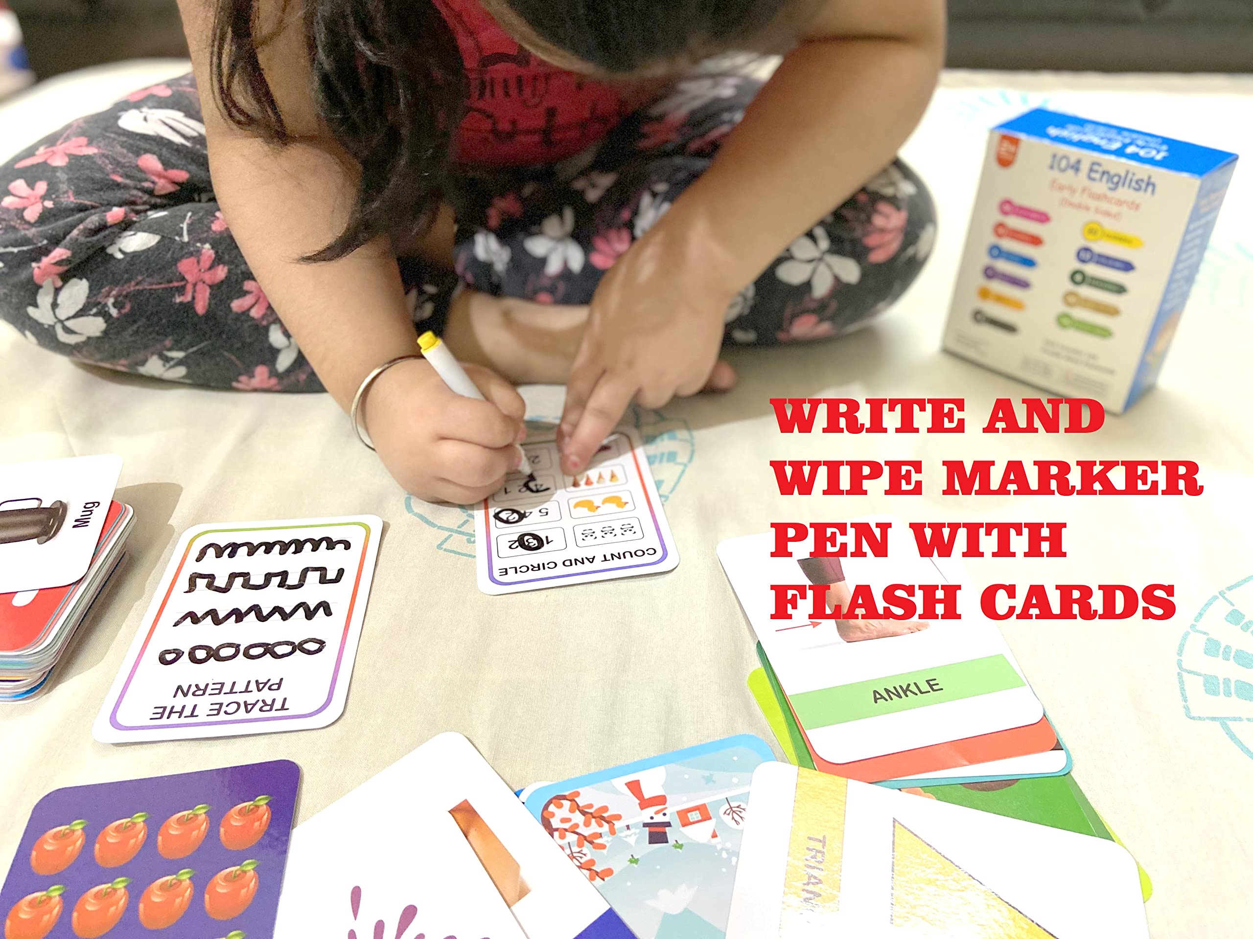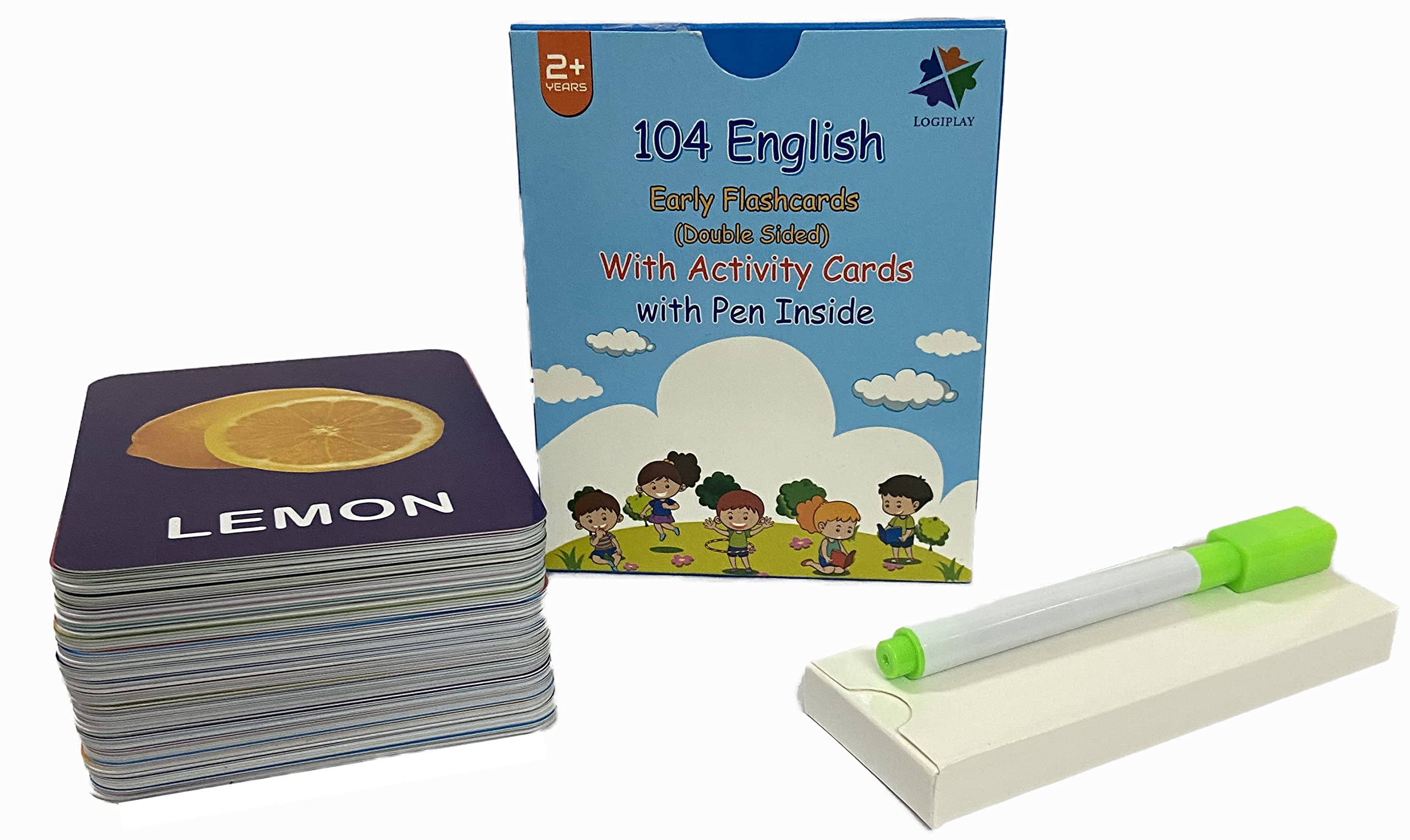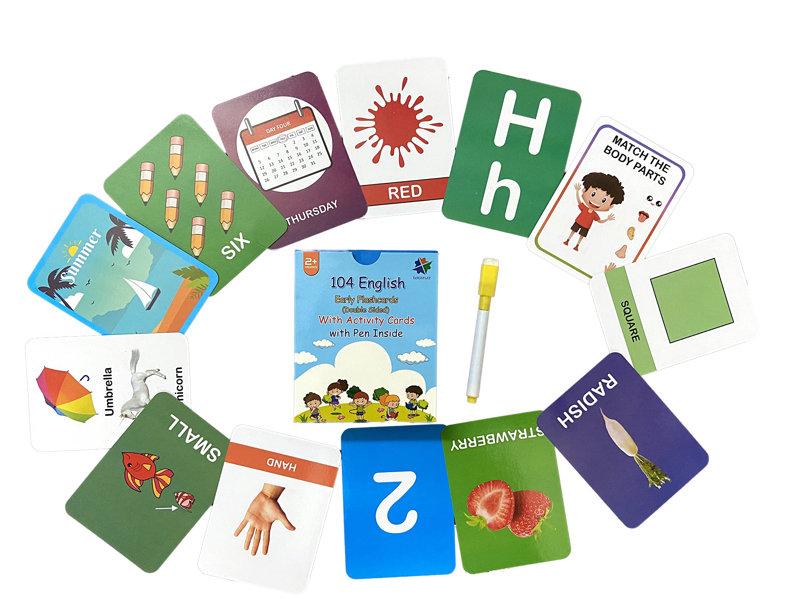 HomeBabyToys & GamesArt & CraftGEOKRAFT English 208 (104 X 2 Double Sided) Big Flash Cards for Kids (Logiplay) Alphabet Numbers Shapes Colors Fruits Vegetables Seasons Size Week Days Body Parts Activity Cards for 2+ Years Old