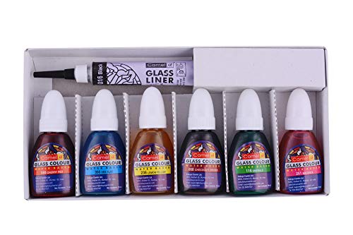 Camel Glass Colours (water based) are an innovative range of colours that are ready-to-use and do not required any medium. They are non-Toxic and come in squeeze type bottles. Ideal for painting on glass acrylic mirror and canvas. They are available in 21 brilliant Shades and glass Liners in 7 beautiful Shades.