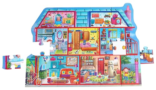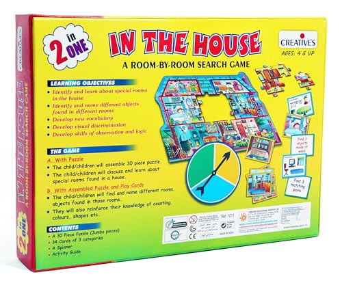 This is a 30 piece puzzle which children can assemble and the learn about special rooms within a house.It also includes playing cards which the children use to find specific items around the house. For example: Find 3 objects made of wood.This helps with developing new vocabulary powers of observation and a sense of logic and order.