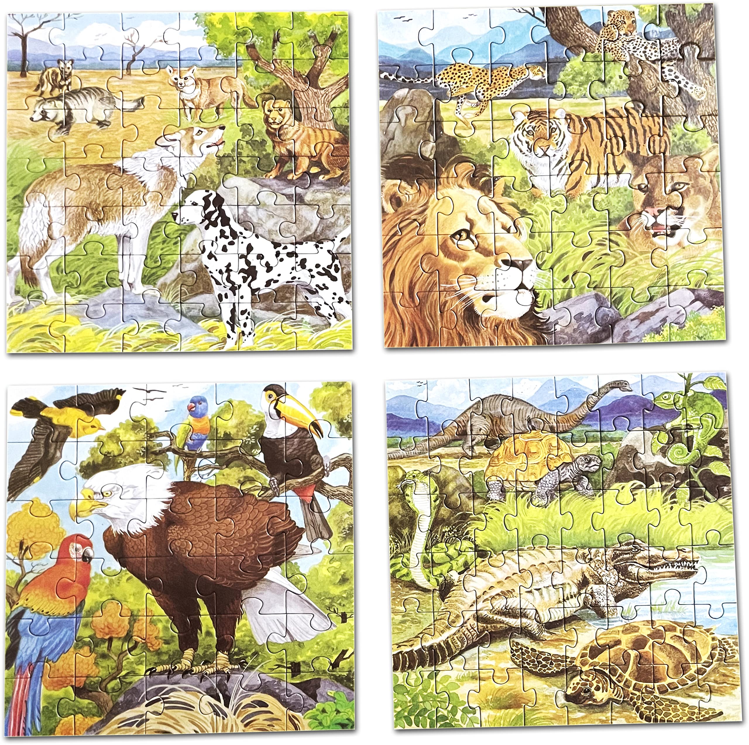 This is a set of 4 puzzles from Creative Educational. It includes 1 x 30 piece 1 x 36 piece 1 x 42 piece and 1 x 48 piece puzzles. The pictures depicted are wild animals.