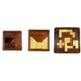 An engrossing set of three puzzles crafted in polished wood to engage your grey cells and pose a light hearted challenge at any soiree. Created for all the beautiful minds by the artisans from Uttar Pradesh, India. Piece 1 - 4x4x0.5, Piece 2 - 4.5x4.5x0.5, Piece 3 - 6.75x6.75x0.75