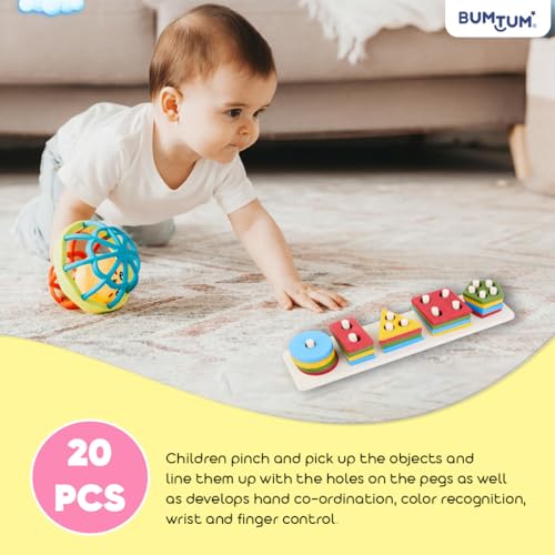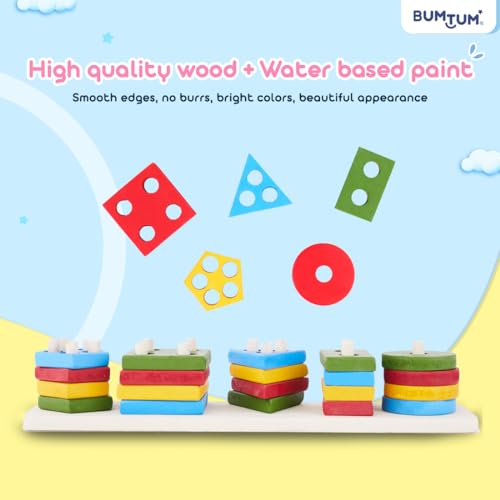 Bumtum Wooden 5 Shape Sorter & Stacking Toys | Geometrical Building Blocks Shape Sorting Toy for Kids Educational Learning Toy Stack - 1