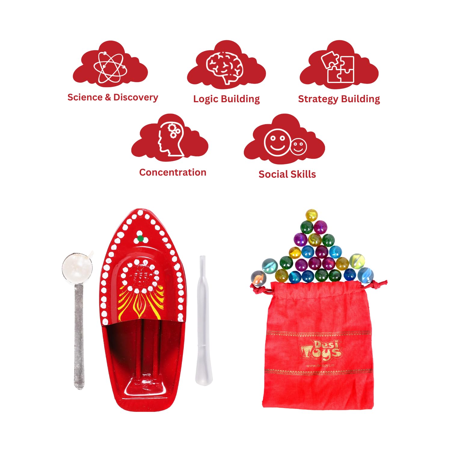 Desi Toys 24 Marble Balls Set with Putt Putt Nav Boat Combo | Classic Marbles Game with Shooters | Multicolor Kanche Golilu Goli Marbles | Traditional Indian for Kids & AdultsToy | Nostalgic Play Set