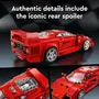 Authentic Ferrari details LEGO toy car features the F40's iconic rear spoiler nose exhaust pipes alloy wheels and air-intake features plus interior details like the gear lever and red seats