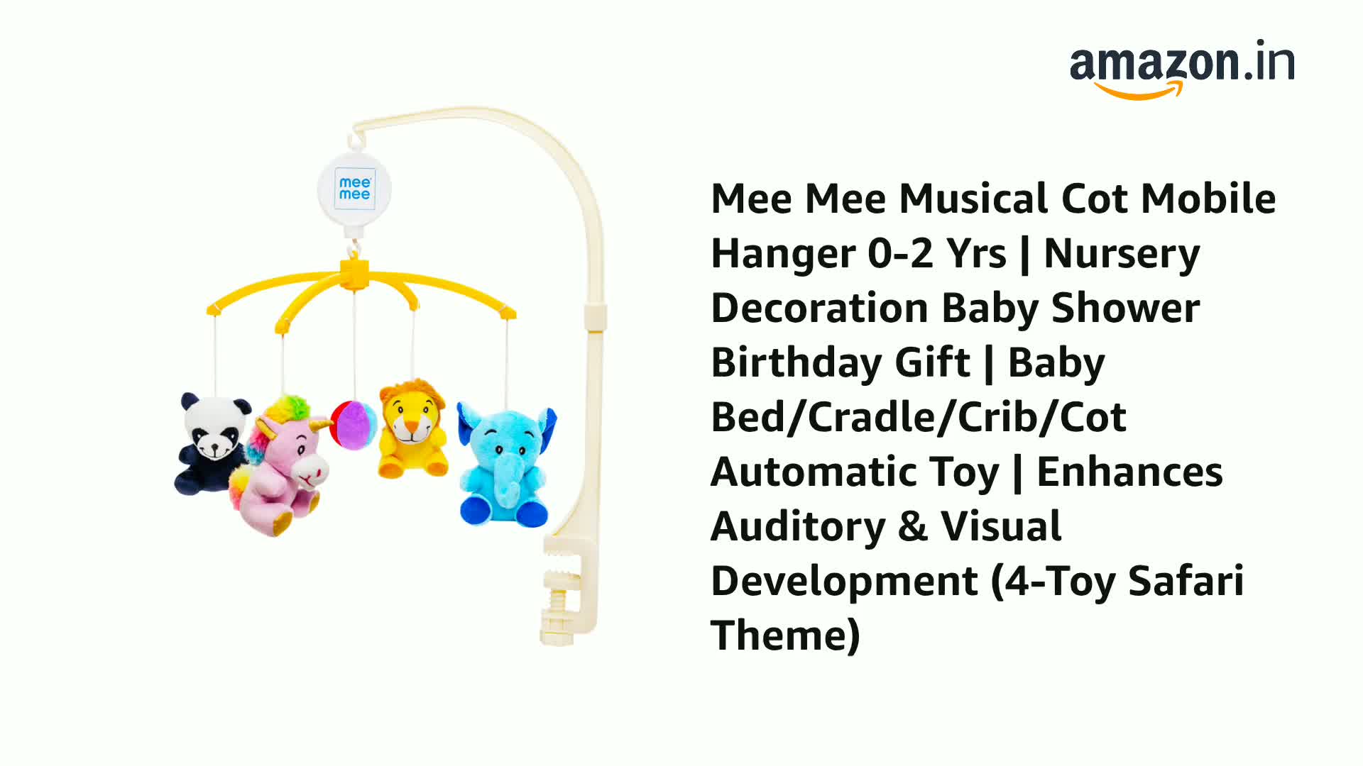 Mee Mee Musical Cot Mobile Hanger 0-2 Yrs | Nursery Decoration Baby Shower Birthday Gift | Baby Bed/Cradle/Crib/Cot Automatic Toy | Enhances Auditory & Visual Development (4-Toy Safari Theme)